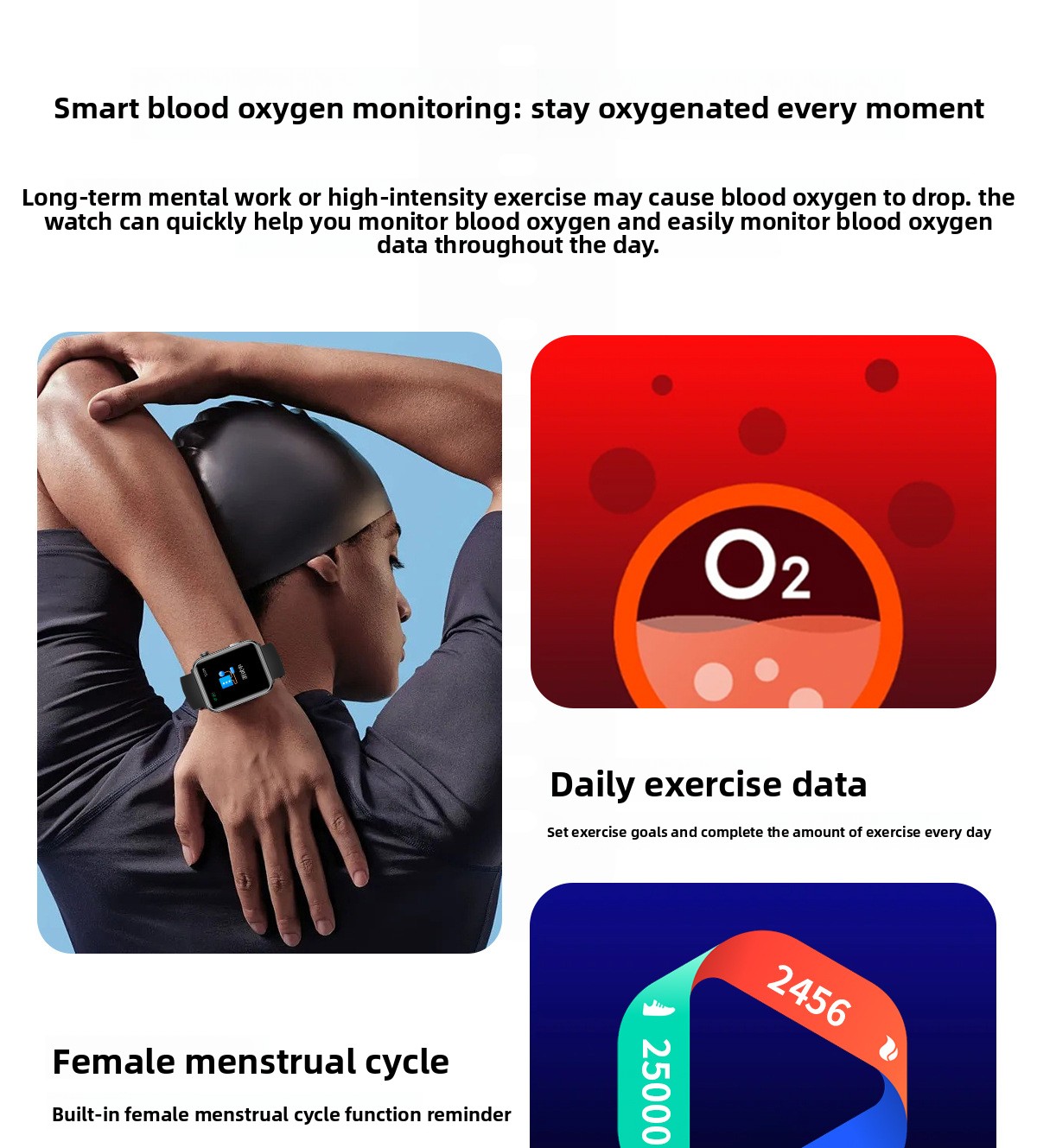 Health Monitoring: Features heart rate, blood pressure, and blood oxygen detection.
