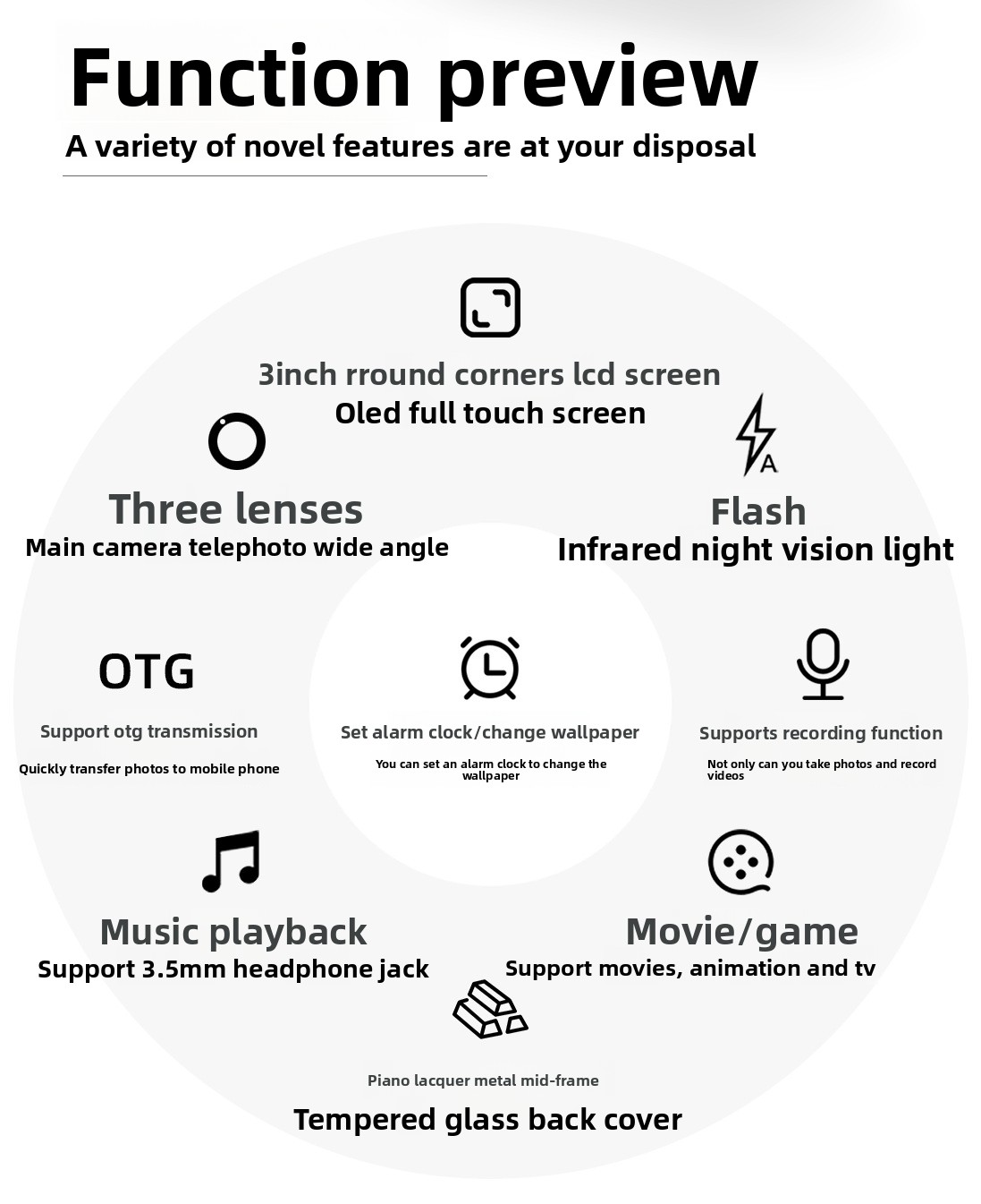 Multifunctional: Supports music playback and digital zoom (16x).