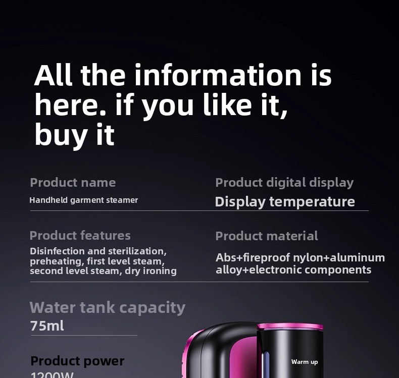Handheld Design: Compact and portable, easy to use for quick ironing.