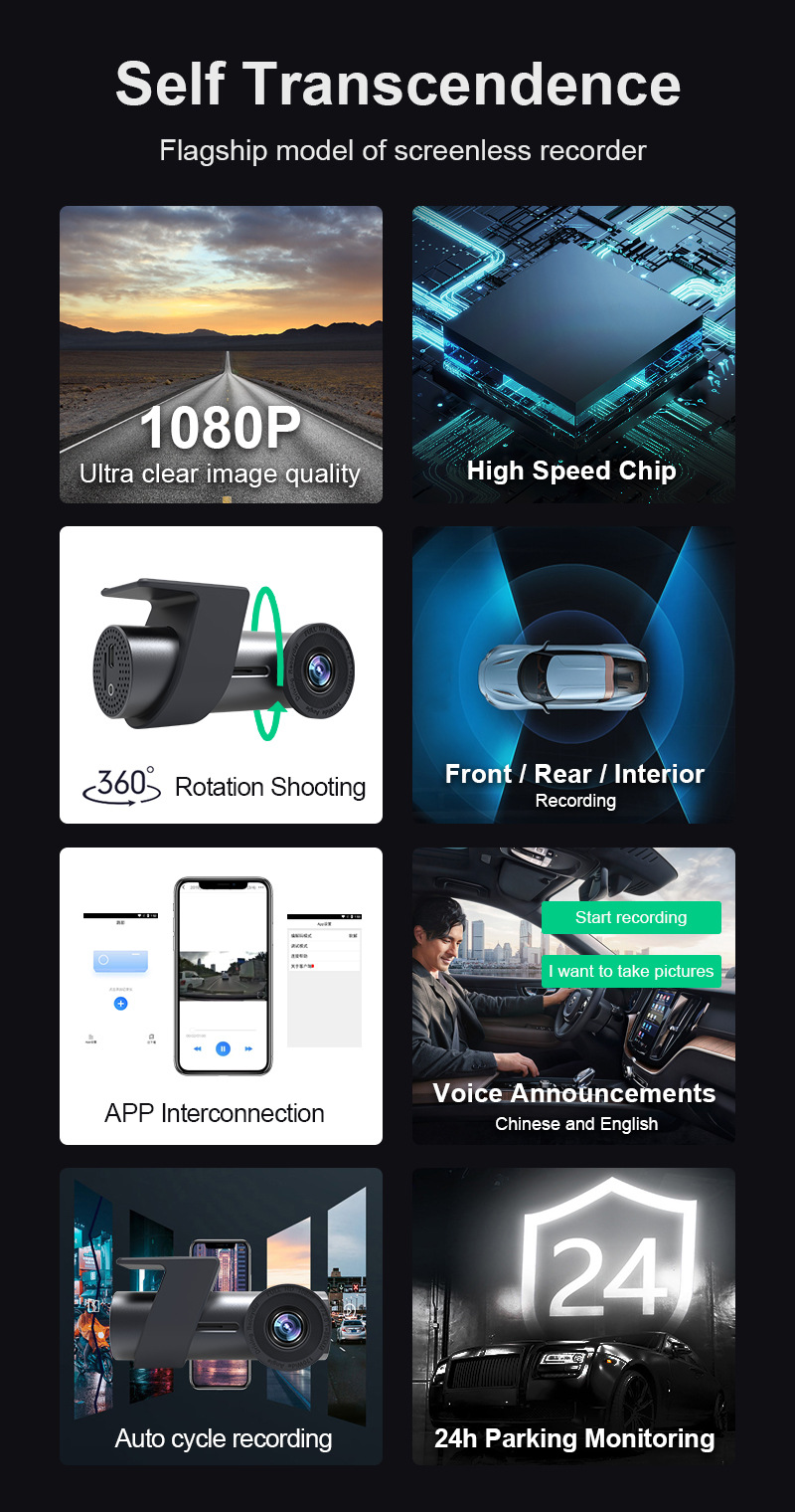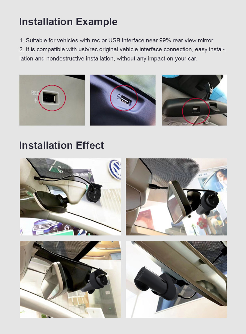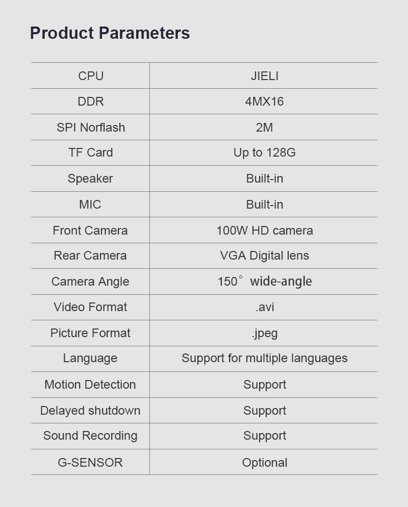 Functions: Reversing image, motion detection, loop video, parking monitoring, night vision light, collision sensing, night vision enhancement, picture deformity correction, short video sharing.